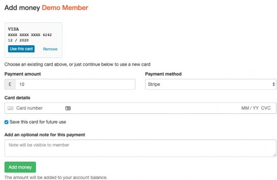 If payment is due, a payment form is shown on the event screen. As with other payment processes, staff and admin can choose a payment method, but members must pay by credit or debit card via the Stripe integration.